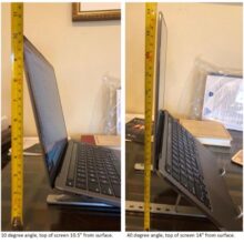 I wish I purchased this much sooner. My neck and headaches have stopped as soon as I put this up. Holds up pretty good as I have 2 kittens that just have to behind my laptop and play while I’m working. Some how it still stands and my laptop hasn’t moved. Don’t take me wrong they did hit one of the legs yesterday and it all came down. Kittens are getting bigger