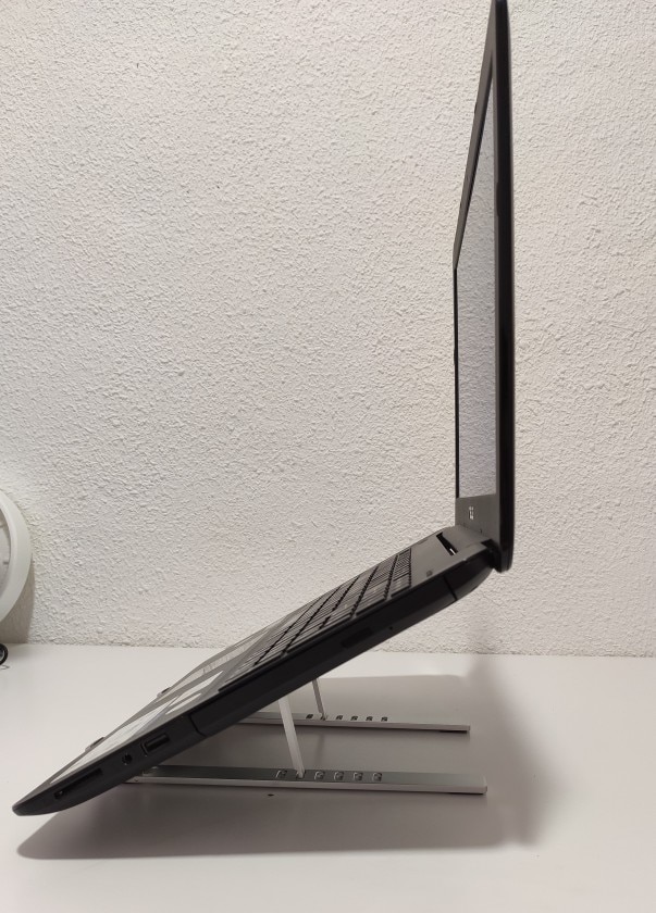 I was on the search for a small laptop stand/raiser that would still allow me to use the laptop while connecting a second screen for viewing zoom meetings, etc. This is absolutely perfect! I have a 14" HP notebook/tablet and this little stand handles it like a champ. It's quite robust and sturdy and has excellent height adjustment. Most importantly, the edges at the bottom that hold the laptop in place do not interfere with me typing at all, which most other computer stands I looked at seemed to. It's a smart, slim and portable design and it makes a huge difference in making sure my laptop can be comfortable and stay cool and not overheat. Excellent product!