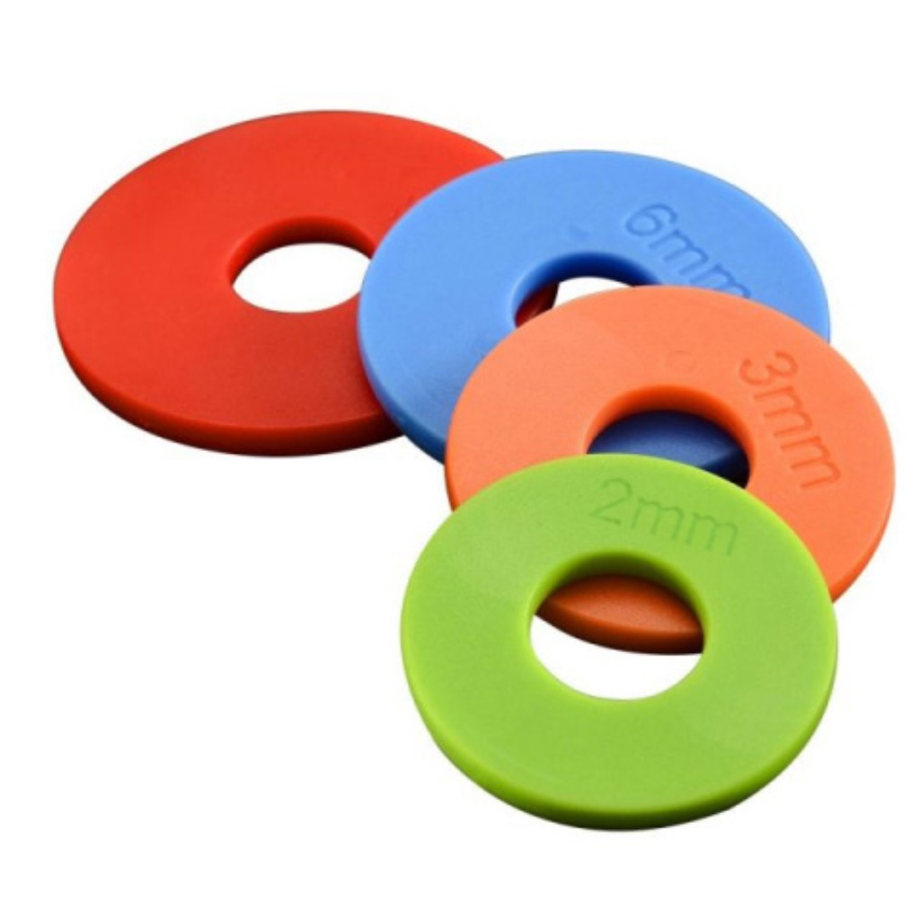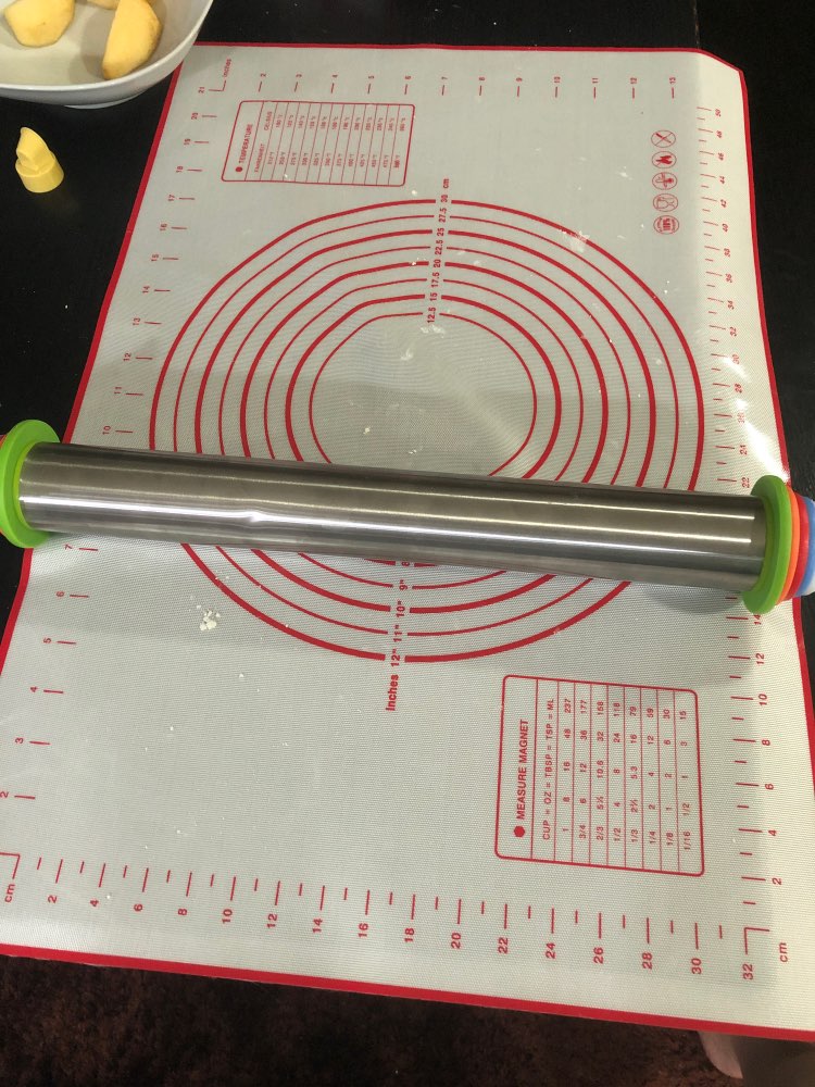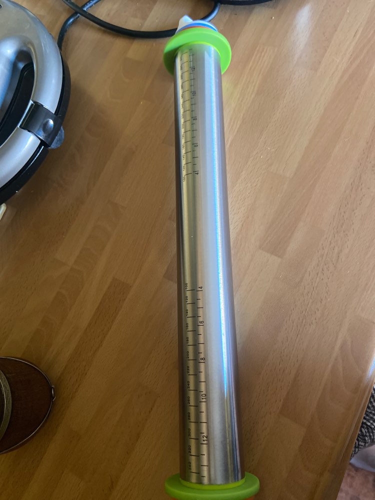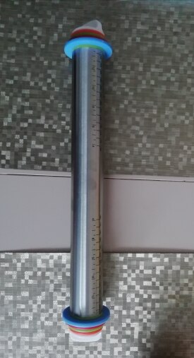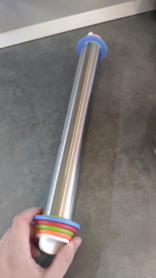 My old wooden rolling pin had painted handles and the paint was flaking off so I needed a new pin. I really liked what I learned about these metal ones that you can control the height with the little sliding rings. The sliding rings are a variety of sizes and help keep the thickness of the dough consistent during the rolling process so I don't have to guess whether it's the same anymore.
