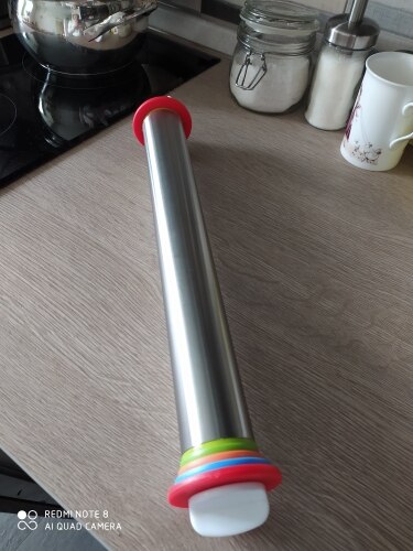 I ordered this for my granddaughter to use when rolling out sugar cookies. It was very easy for her to use and all the cookies came out the same thickness. One minor thing she did not like; the flour did not stick to the stainless steel, as easily as the wooded one she is used to using, so sometimes the dough would stick to the pin. We loved the mat that came with it. It completely stuck to the table, which made it easy for her to roll out the dough.