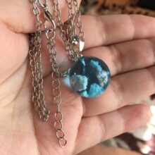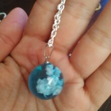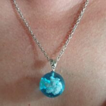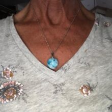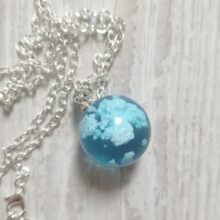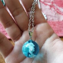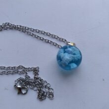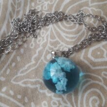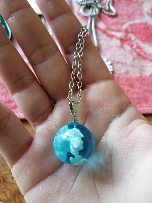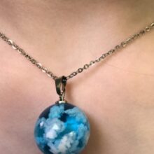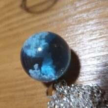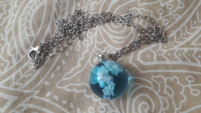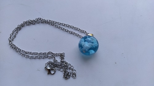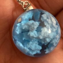 I wasnt sure what to expect, however, this Blue Sky Cloud Resin Necklace is a pretty piece of casual costume jewelry. It might not go with a cocktail dress but it looks cute with jeans. The resin globe is about 3/4 of an inch round. Reminds me of a gum ball. You can see the cloud formations are different through out the pendant and I am sure each one is unique and no two are the same. A few areas on mine the white cloud is seen on the edge, not the blue resin. The chain is about 18-20 inches in overall length. Its not fancy, just a casual piece of costume jewelry that is cute. Its priced less than $20. It comes in a nice manilla colored box to give as a gift.