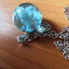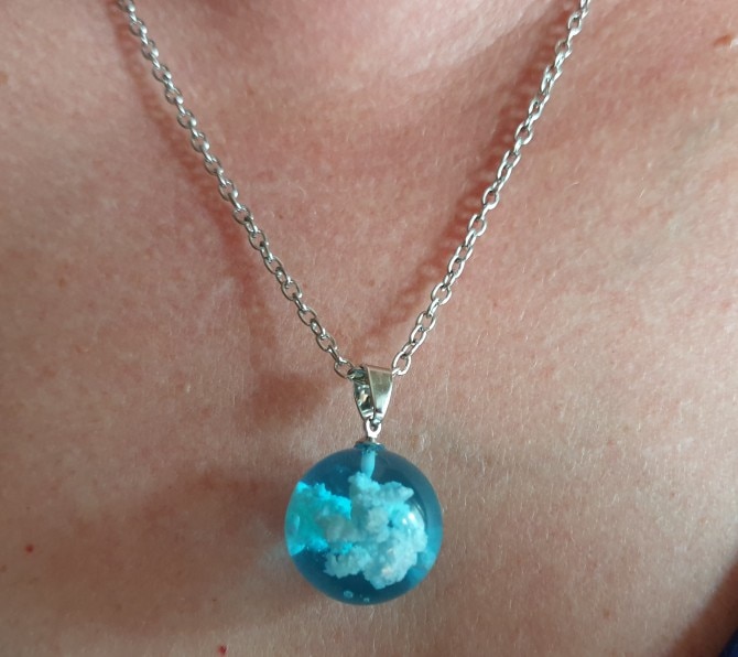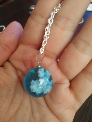 My daughter saw this necklace on Pinterest and asked for it for her birthday. It seems a little delicate but it is a unique piece of jewelry. It looks like a tiny crystal ball filled with air with a poof of clouds. It feels pretty solid for the size. My only concern would be to pendent to chain connection.