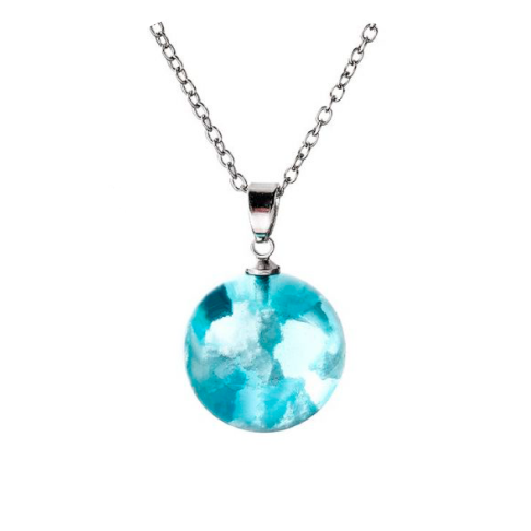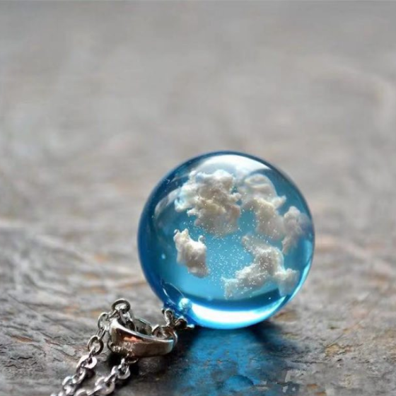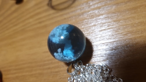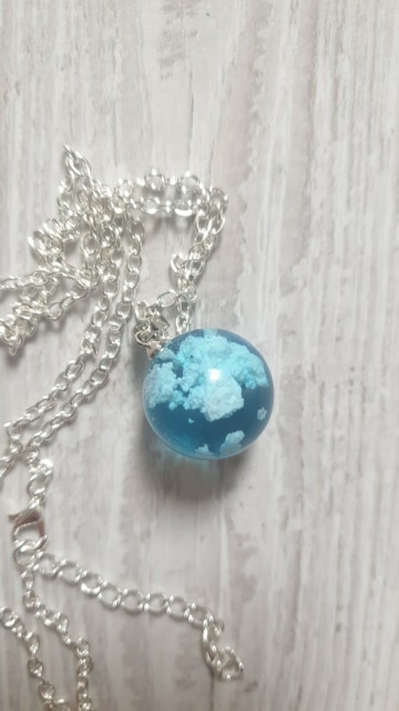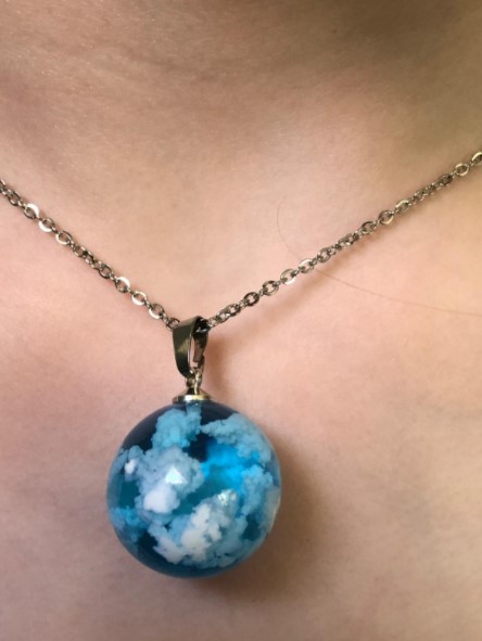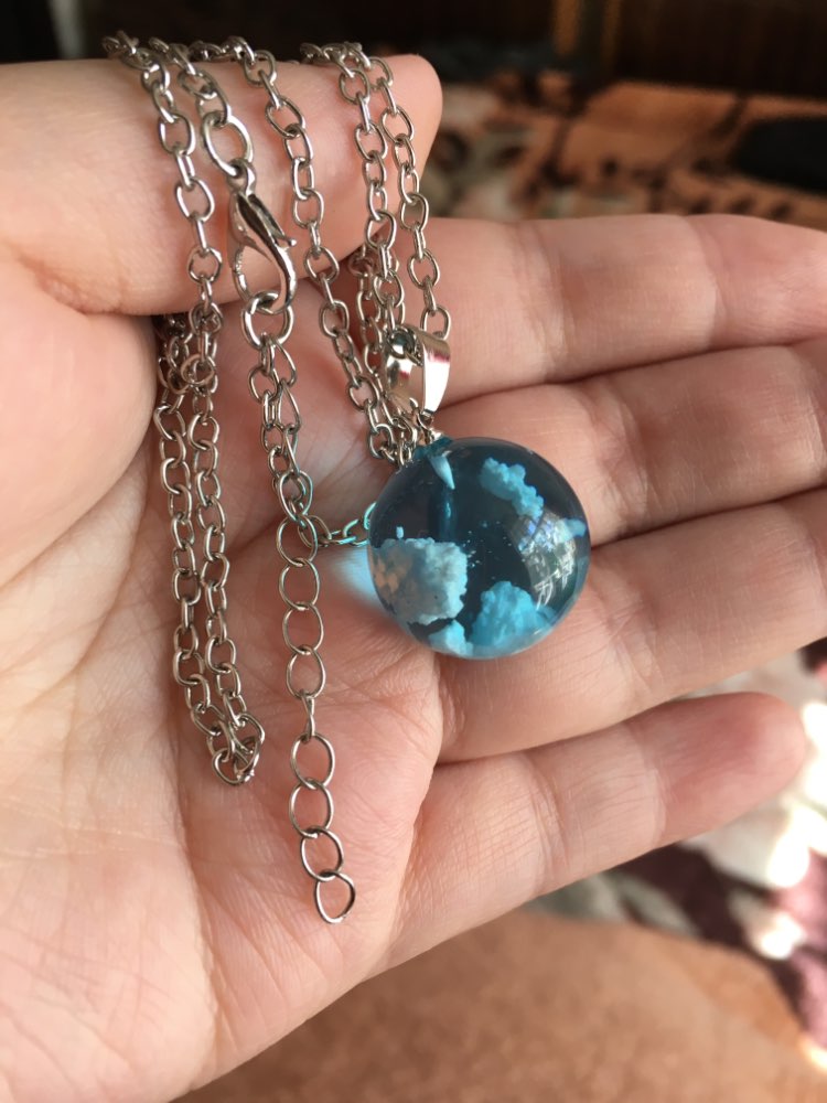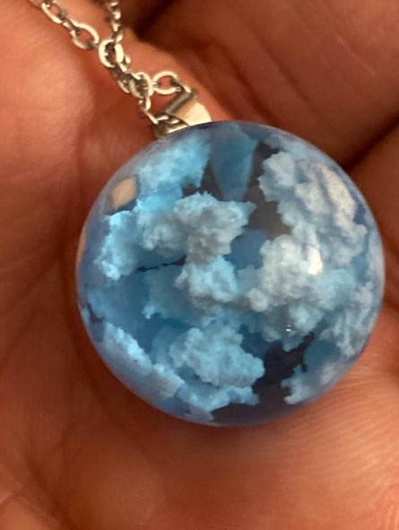 This necklace is ok, but in person the resin looks much more like plastic than glass. And the white parts are fine, but they don't look like clouds. It does seem like an item that would vary with each piece, though. Overall, this necklace is fine, but feels more like a toy than a piece of jewelry for an adult.