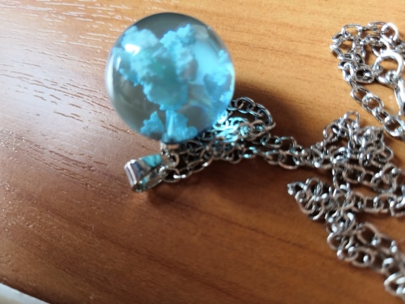I was wearing this when a friend came over, and he instantly noticed and commented that he liked it. It's a simple necklace with a lobster clasp. My ball has a lot of "clouds" in it, but what I don't like is where the clouds contact the inside of the sphere. The touch points look like little bits of bright white paper stuck against the plastic. While I do like this necklace, I think it's more appropriate for younger women. I think a young teen would love it because it's so different. The length is also adjustable, because the manufacturer has added a 2" length of chain with larger loops in which which you hook the lobster clasp.