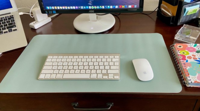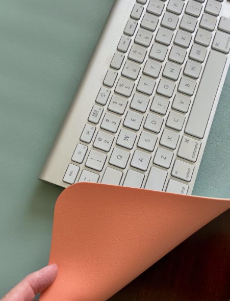 It's perfect for my Apple wireless keyboard and mouse. It protects the main work area of my desk while not interfering with my laptop/external monitor arrangement and other desktop items. The colors are even better than I had expected. the orange is more of a soft peach color, and the green is a silvery sage color. The pad arrived rolled with tissue paper in a sturdy box with an enclosed silica packet. Love this product!