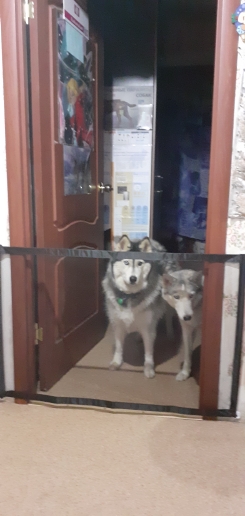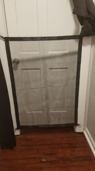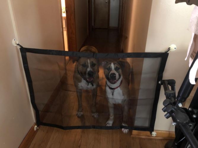 It’s easy to store since it’s flexible and takes up way less space than a baby gate. It holds back my dogs and is very easy to install onto any door or pathway.
