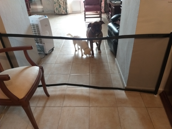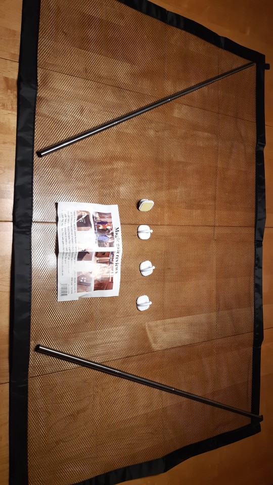 This review is for the magic gate for dogs. This is super easy to put up and secure it to any spot needed. It is also super easy move around to another space if needed. It seems to be pretty sturdy and strong once it is put up. My dogs are strange and afraid of things like this. They can easily jump over it if they wanted to. But it works for exactly what I need it for. They are much cheaper than the child gates and less bulky and heavy and some much more better overall. Overall I think it is a great value and I would definitely recommend buying this.