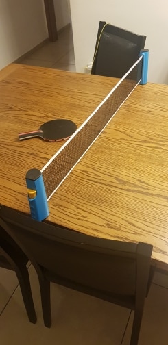 This is an amazing game if you have a large dining table. The net has a padded clamp so cannot scratch the table. Great fun for any age!