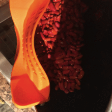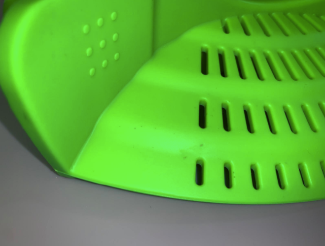This makes it so much easier to dump out water when making pasta of any type. Fits very well to most sized pans and dishwasher safe. My 9 yr old granddaughter can now dump the water out of the Mac and cheese easily. This is a must have for people who make Pastas of any kind that require dumping out hot water. It is made out of a type of rubber so I’m not sure if I would use it for hot grease, but it may be ok for that too since a lot of spatulas etc are made from similar material