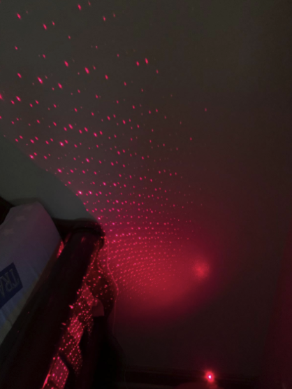 As the picture. The quality is good and arrived really fast. Great work! Be sure you have enough room for this to stick out. I had it plugged into an adapter and then in the wall. Sticks or into room quite a bit. It's tempting for grandsons to look into the laser... Very bright and not safe to do that! I had to move it out of their room. Should have read more carefully that it's @6" of "stick". The little lights are very cool. So....I got a lightbulb adapter and plugged it into a little lamp. Now it's safe and still provides really cool lights at night. Grandsons love it.
